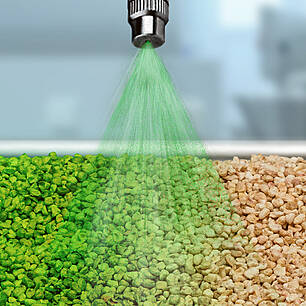 合成ポリマーやシリコーンによるレオロジー制御は、時としてスプレー性を損なうことがある。このため、単純なスプレーノズルでは微細なスプレーパターンが得られない。噴霧角度の設定やブレイクアウトが難しい。点滴パターンが不均一だと、肥料が葉面に不均一に分布する。正確な投与が不可能になる。